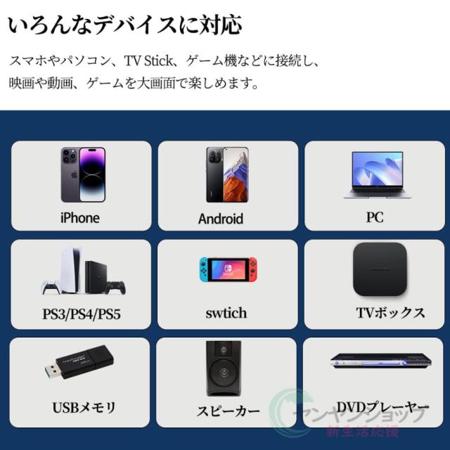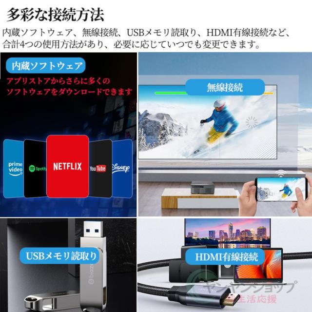 この家庭用プロジェクターはWi-Fi、Bluetooth接続以外に、HDMI、USB端子が搭載しており、ノートパソコン/スマホ/TVボックス/DVDプレーヤー/USBメモリー/Google Chrome cast/X-Box/PS3/PS4など様々な周辺機器に接続できます