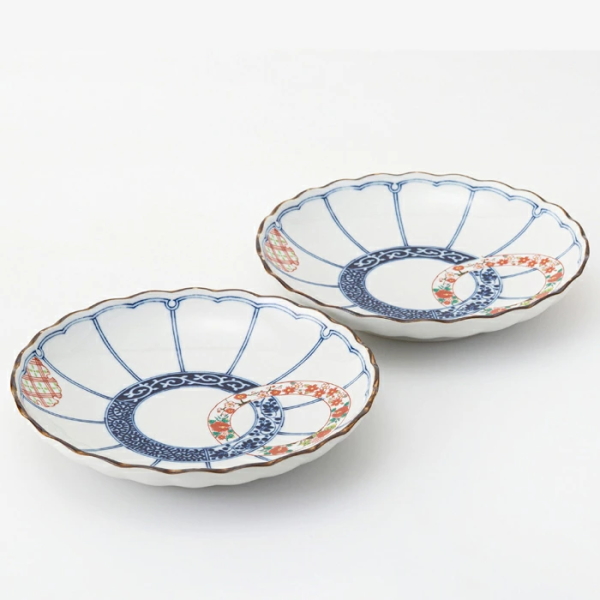 波佐見焼 染錦輪つなぎ 菊型組大皿 31112 2個、和皿、食洗器可、電子レンジ可、西海陶器、日本製、国産、化粧箱入、送料無料、美濃焼、テーブル、揚げ物、煮物、お刺身、サラダ、和の食卓、映える