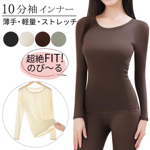 長袖 インナー シャツ レディース 肌着 伸縮性 ストレッチ クルーネック 丸首 薄手 シンプル 無地 快適 フィット 大きいサイズ 黒 白 茶 緑 rr-053