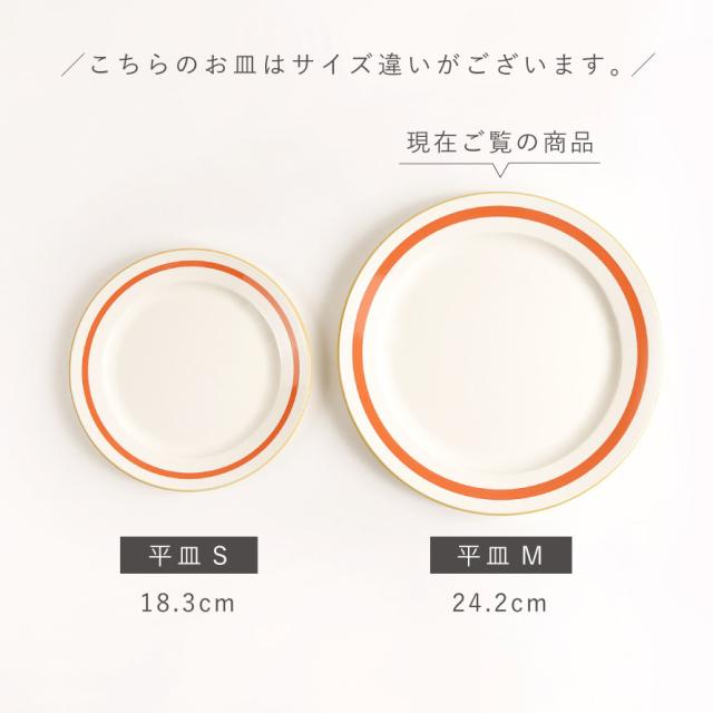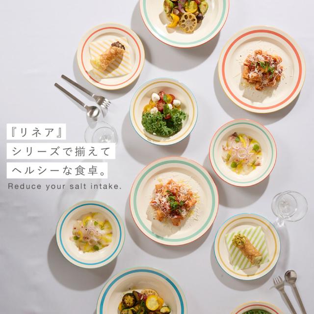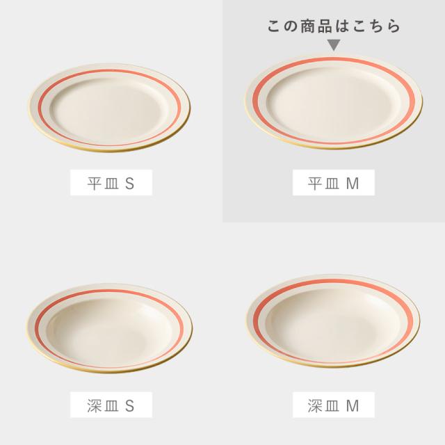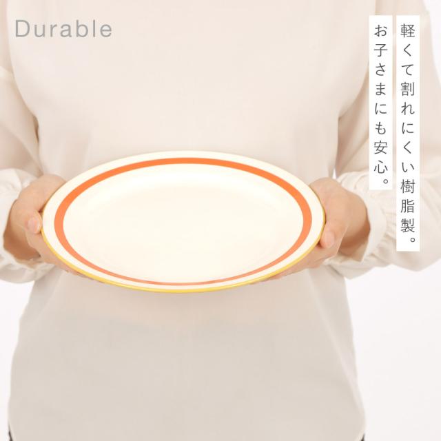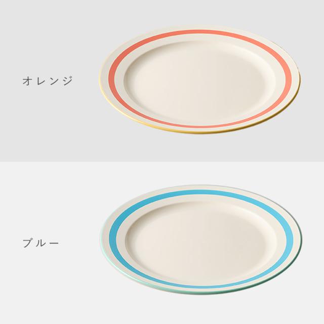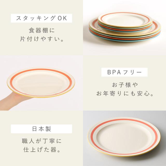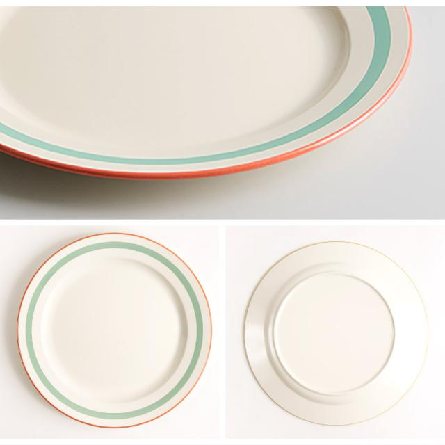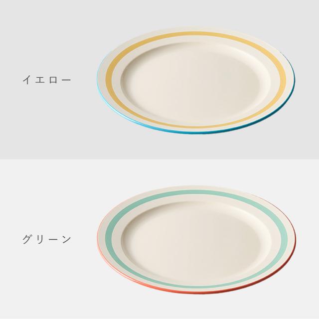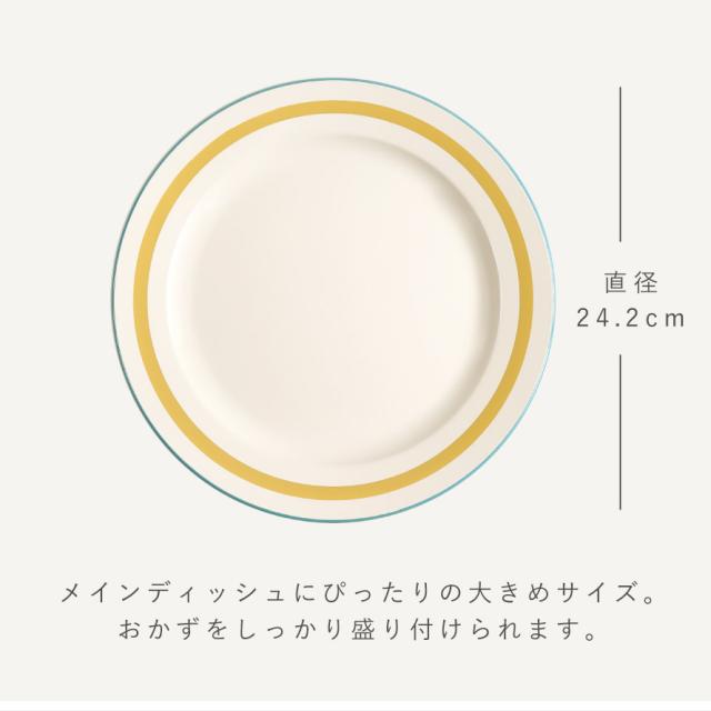 お皿の縁のラインがアクセント。少しレトロ感のあるデザインは食卓を楽しく彩ります。家庭用はもちろん、カフェ、アウトドア、お子様用に使っても。