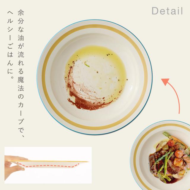 お皿の中央が盛り上がった形で、食材が液体に浸りにくい構造。ドレッシングや油が縁の方に流れ、カロリーや塩分の過剰摂取を防ぎます。体を気遣う方にぴったり、「勝手にヘルシー」になるお皿です。
