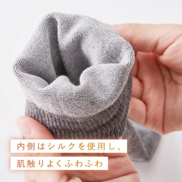 肌にあたる内側は天然素材のシルクで仕立て、なめらかでチクチクしない肌ざわり。敏感肌の方や高齢の方にも安心です。