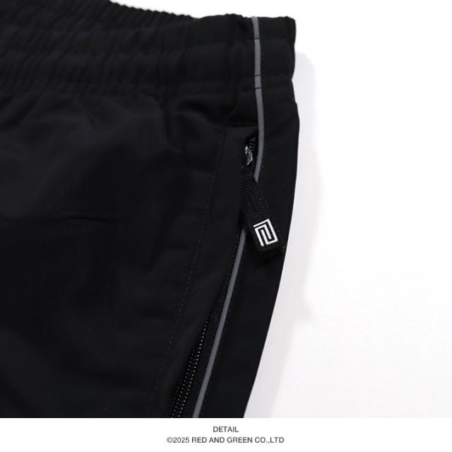 光を反射するリフレクターのパイピングラインを施した、オーバーサイズのナイロンパンツ。