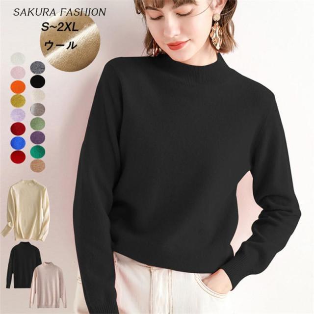 ウール ニット レディース トップス セーター 長袖 ゆったり 冬 秋 春 ニットウエア プチハイネック 無地 起毛感 シンプル ベーシック ウール100%ニットセー
