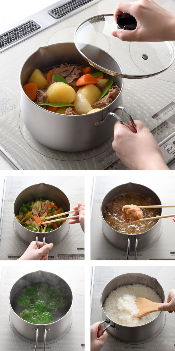 IHクッキングヒーターをはじめ、オール熱源に対応しています。3〜4人分のお料理に使いやすく、お米なら3合を炊くことができます。