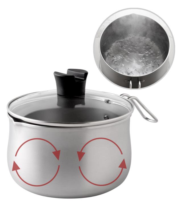 ステンレスの高い熱伝導率と対流性を高めるコロンとした丸いかたちで、あっという間にお湯が沸きます。忙しい朝や急ぎの一品にも対応する、頼れる早炊き設計です。
