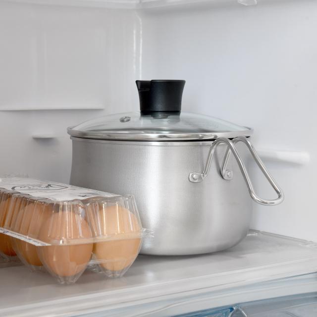 1〜2日程度ならお鍋のまま保存ができます。ハンドルが下向きに設計されているので、冷蔵庫でも場所を取らずすっきり収まります。