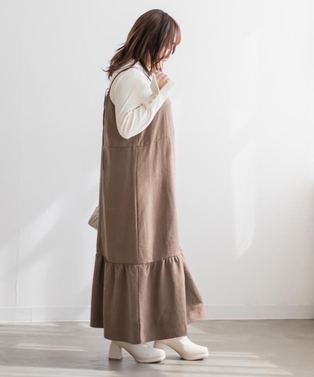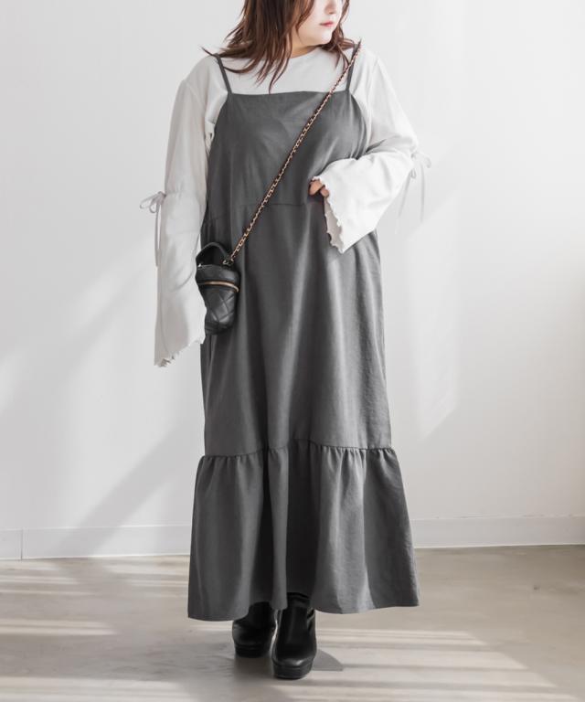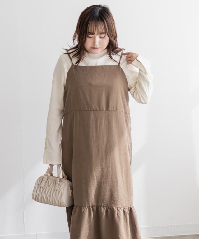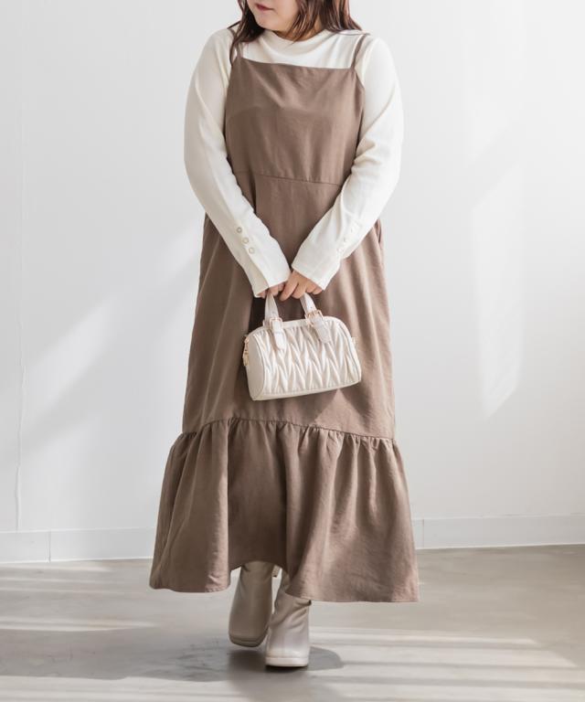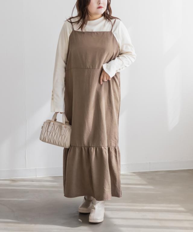 | 3Lサイズを着用しました。少しゆとりのあるサイズ感で、いつもの3Lサイズよりは小さめだったのでサイズ確認をお勧めします!ゴムのないすっきりした仕様だったのでワンサイズ大きくてもいいかもしれないです◎肩紐は調節できる仕様です。秋冬らしい生地で、季節感たっぷりだけど、厚みが無く軽く楽に着用出来ました!すっきりとしたシルエットで、裾の切替からひらひら広がるのが可愛いです!インナー次第で長く使えてお勧めです! |