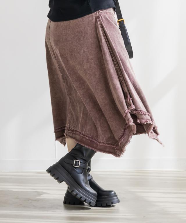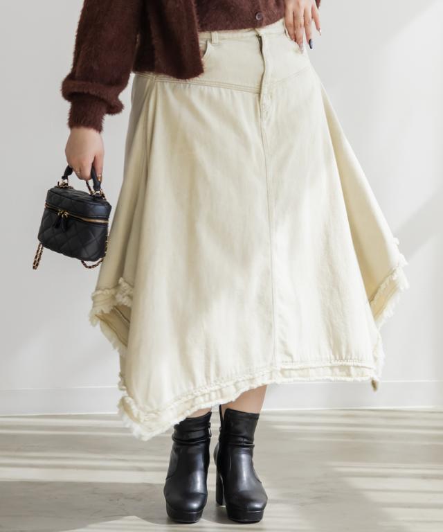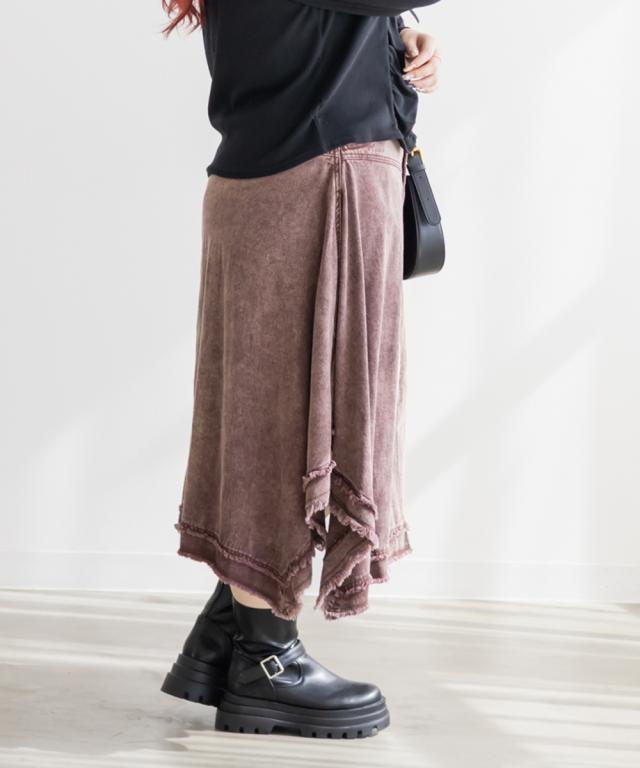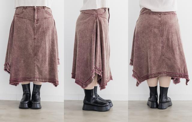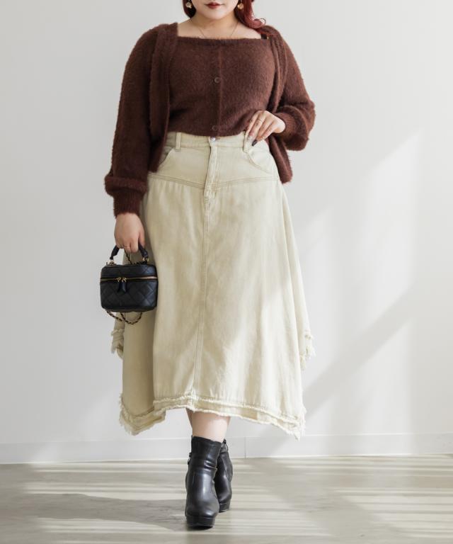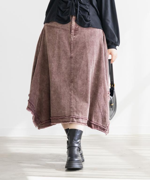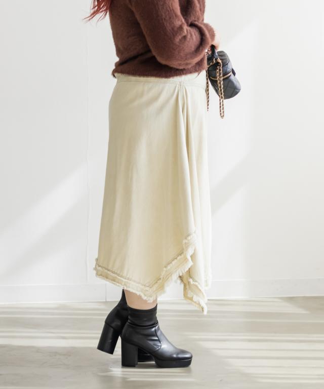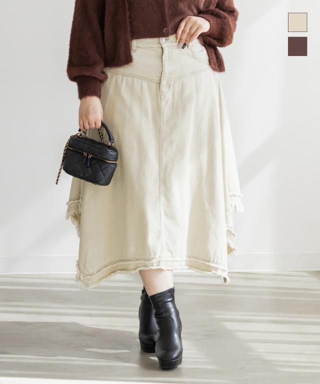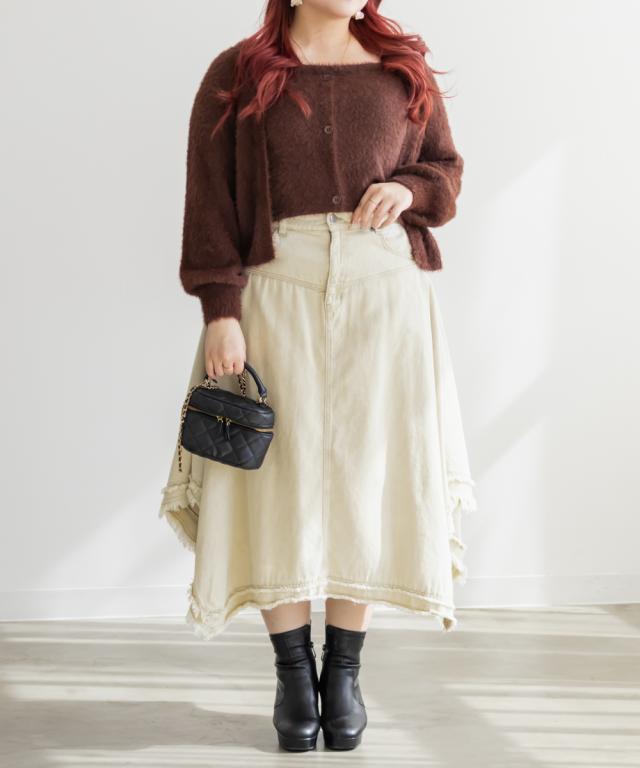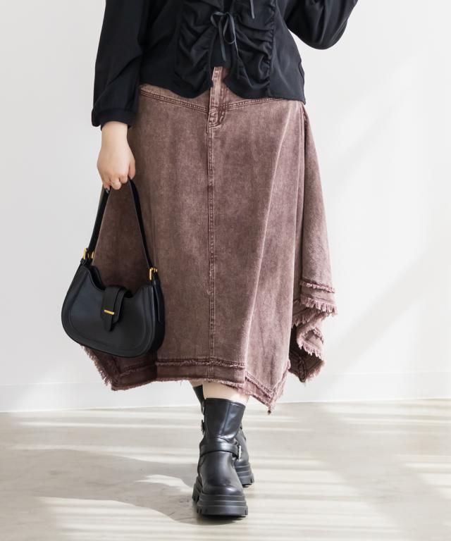 | 3Lを着てピッタリのサイズ感でした。ウエストは後ろゴム仕様で穿き心地もラクです。生地にほどよいハリがあるので体のラインを拾わず、すっきりとしたシルエットで着られました。フリンジデザインが目を引くおしゃれなスカートで、裾のイレヘムデザインが動くたびに軽やかで、シンプルなトップスを合わせるだけでもコーデが決まります◎ 丈感もミディ丈でバランスが取りやすく、ブーツにもパンプスにも合う1枚です♪ |