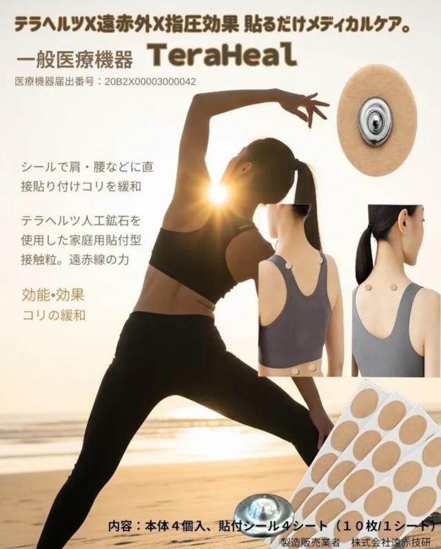 商品詳細: Tera Heal(テラヒール)は、テラヘルツ人工鉱石を使用した家庭用貼付型接触粒。 首、肩、腰など気になる部位に直接貼るだけで簡単にセルフケアが可能。