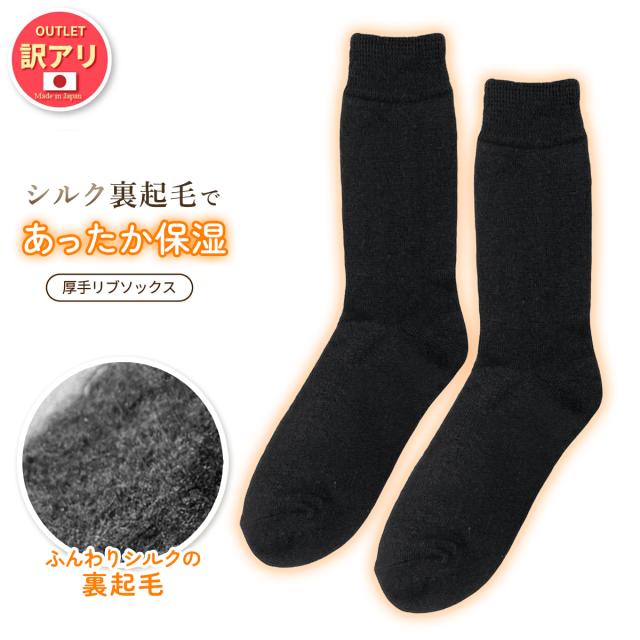 【訳アリ アウトレット】厚手 シルク裏起毛 リブソックス 裏面シルク起毛生地 温活 レディース ブラック 22-25cm【メール便送料無料】
