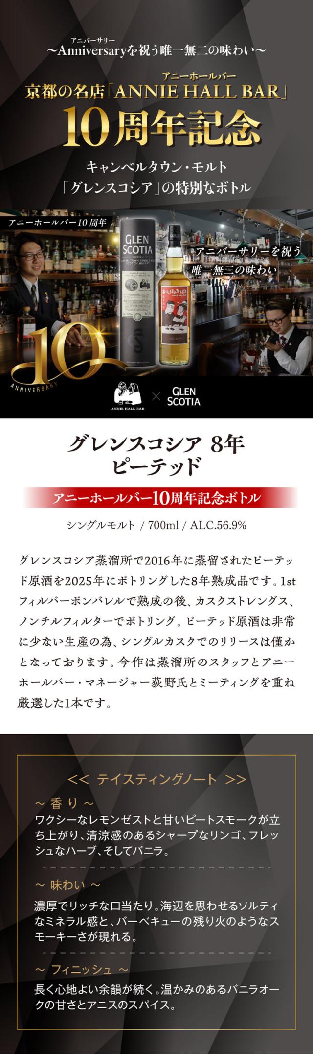 京都に店を構えるオーセンティックバー「アニーホールバー」開業10周年を記念した、スコットランド・キャンベルタウンの老舗蒸溜所「グレンスコシア」との特別アニバーサリーボトル。