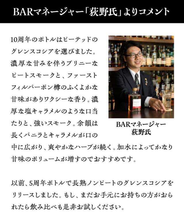 10周年のボトルはピーテッドのグレンスコシアを選びました。濃厚な甘みを伴うブリニーなピートスモークと、ファーストフィルバーボン樽のふくよかな甘味がありワクシーな香り。濃厚な塩キャラメルのような口当たりと、強いスモーク。余韻は長くバニラとキャラメルが口の中に広がり、爽やかなハーブが続く。加水によってかなり甘味のボリュームが増すのでおすすめです。