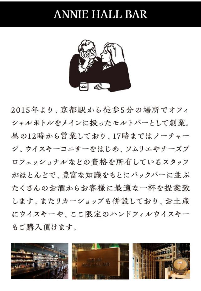 2015年より、京都駅から徒歩5分の場所でオフィシャルボトルをメインに扱ったモルトバーとして創業。昼の12時から営業しており、17時まではノーチャージ。ウイスキーコニサーをはじめ、ソムリエやチーズプロフェッショナルなどの資格を所有しているスタッフがほとんどで、豊富な知識をもとにバックバーに並ぶたくさんのお酒からお客様に最適な一杯を提案。またリカーショップも併設しており、お土産にウイスキーや、限定のハンドフィルウイスキーも購入可能。