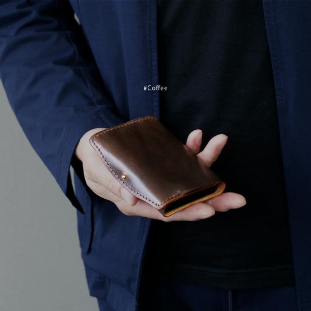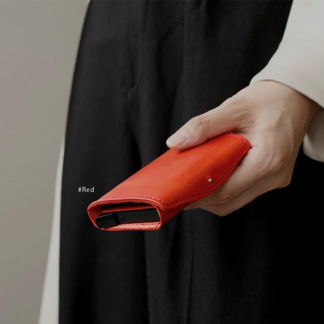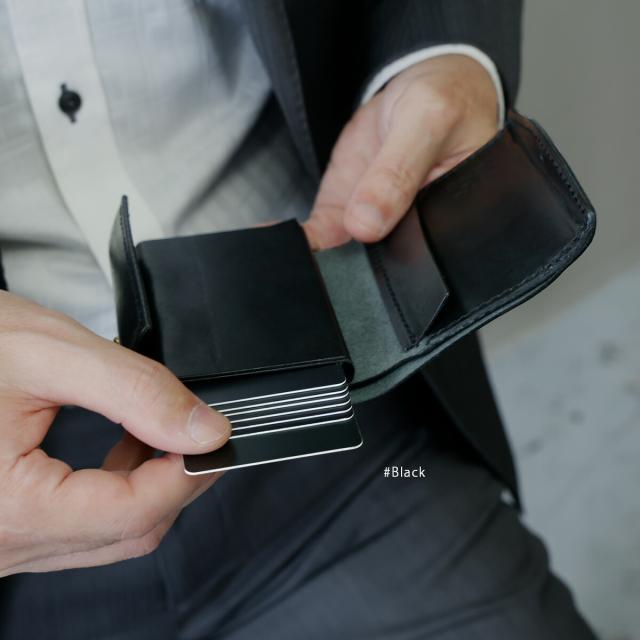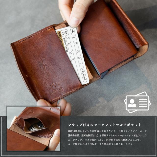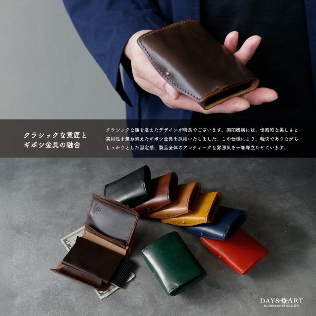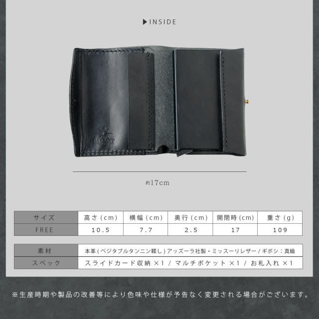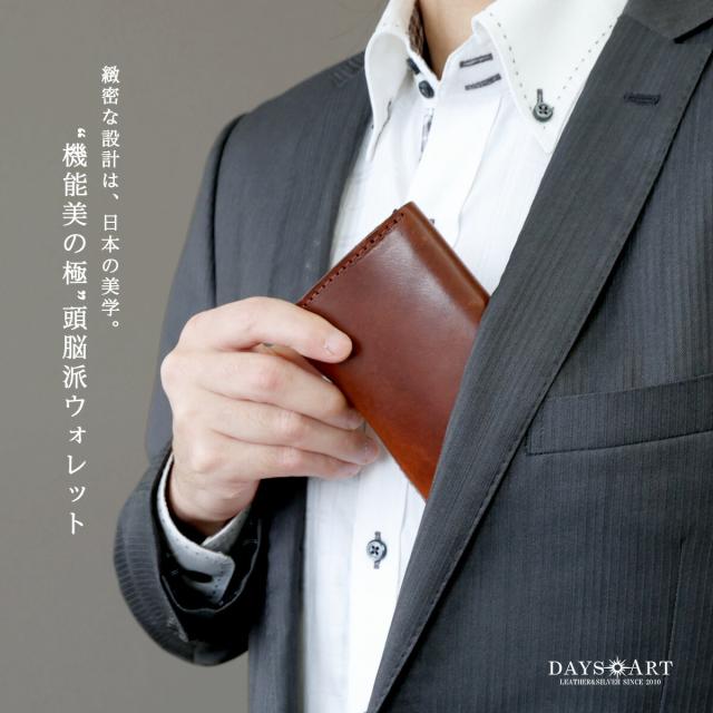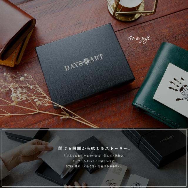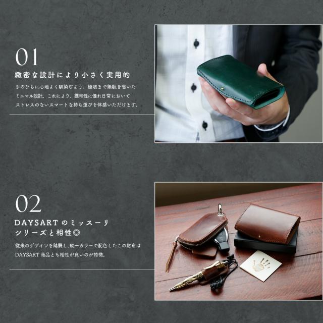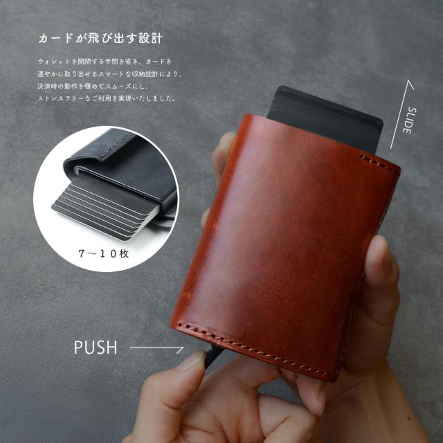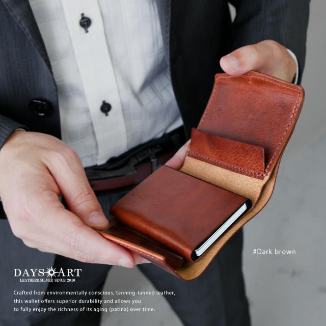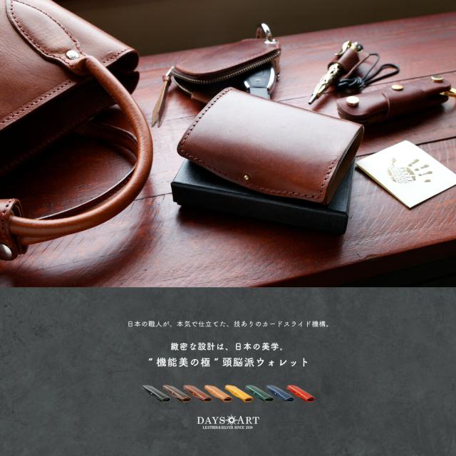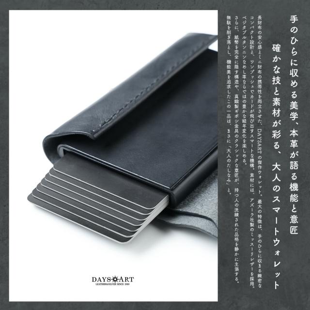 手のひらに収まるミニサイズながら、長財布級の収納力を備えたDAYSARTの本革ウォレット。カードはワンプッシュで飛び出すスライド式で、支払い動作もスムーズ。