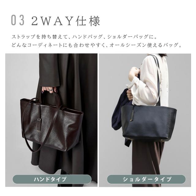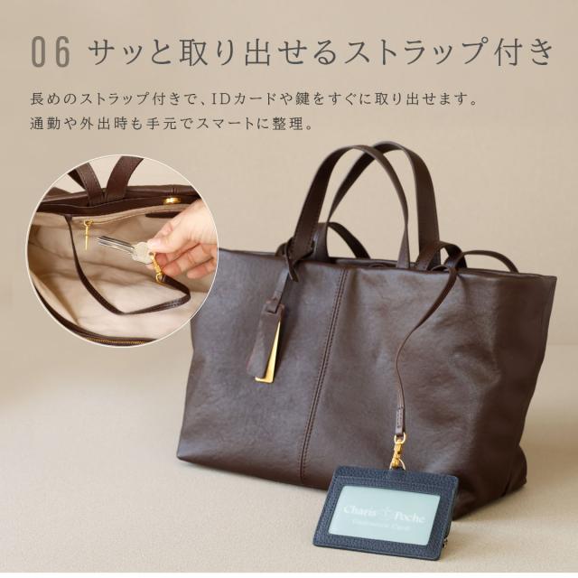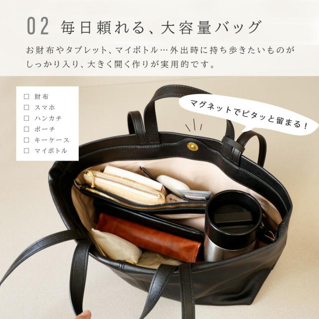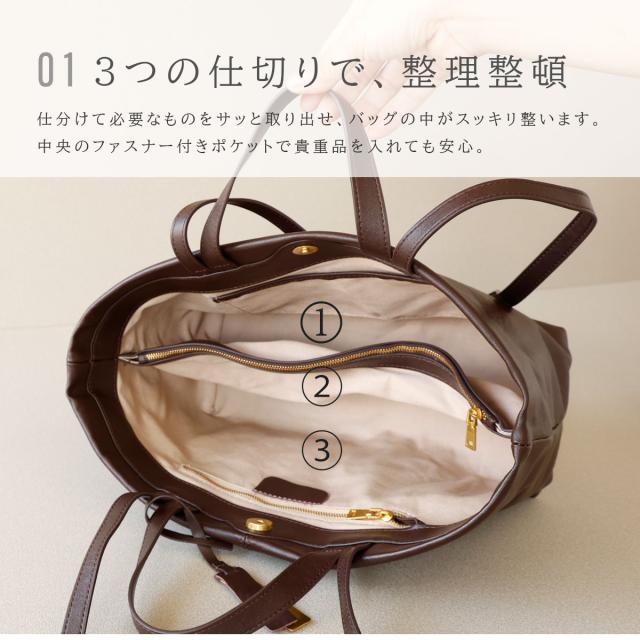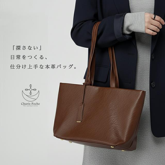毎日の「探さない」を叶える本革トートバッグ。3つの仕切りで荷物をすっきりと整理でき、必要なものをサッと取り出せます。柔らかく手に馴染む本革を使用しているため、大容量でありながら軽やかな持ち心地を実現。肩掛けしやすい長めの持ち手で、通勤や通学も快適です。さらに、IDカードや鍵を付けておける便利なストラップ付きで、バッグの中で迷子になる心配もありません。カラーはベーシックで合わせやすい3色展開。