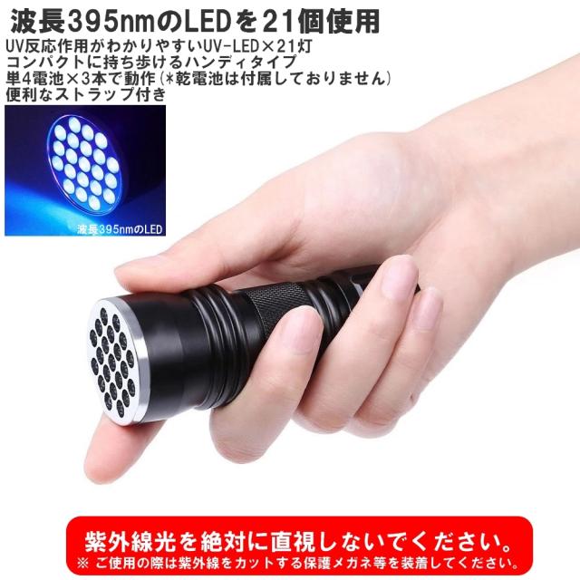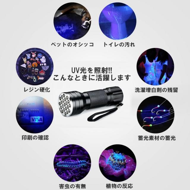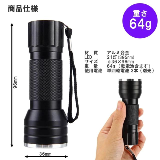 ブラックライト 21LED UVライト 395nm 紫外線ライト 懐中電灯 ブルーライト ハンディ アルミ合金材質 単4形電池 コンパクト レジン用硬化ライト ペットのオシッコ 目には見えない 汚れ対策 釣り ブラックライト uvレジン ネイル 送料無料