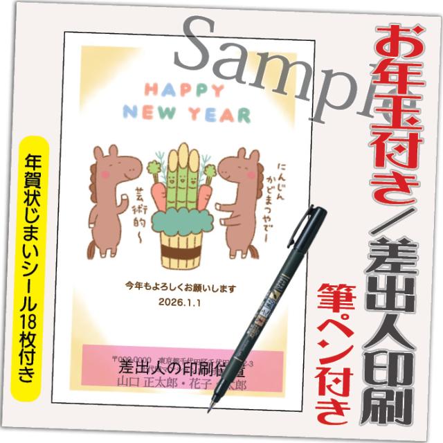 年賀状 年賀はがき 4枚 お年玉付き 年賀状じまいシール付 筆ペン付き 2026年 差出人印刷込み(デザイン:HA100) うま 馬 午年 かわいい イラスト
