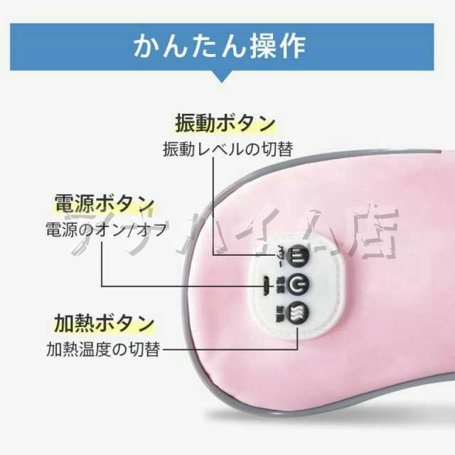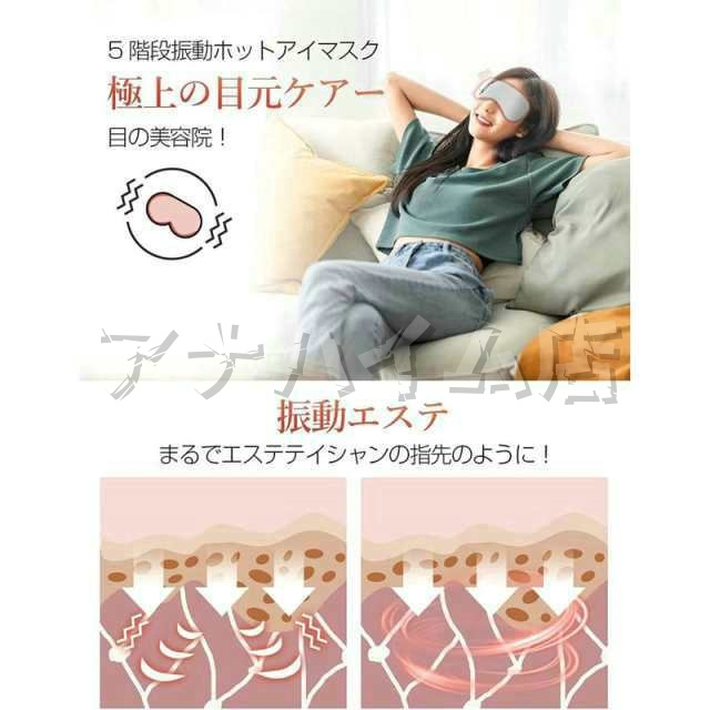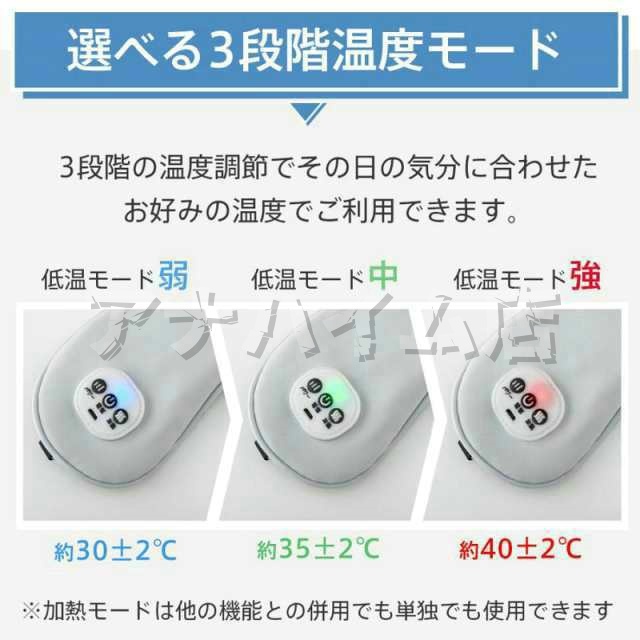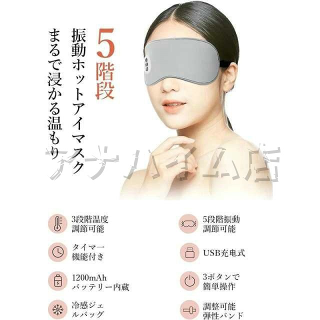 高(約40℃)、中(約35℃)、低(約30℃)の3つの暖房モードと、5段階の振動モードを搭載し、お好みに合わせて自由に選ぶことができます。 遮光性の高いアイマスク 就寝中の使用に適しているす。発熱機能をオフして、冷却ジェル×振動での使用もできます。遮光性に優れている アイマスク 睡眠用にも適しています。 |