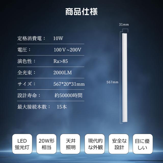 - 従来の蛍光灯と比べ、消費電力を約50〜70%削減する省エネ設計。LED化により長寿命で交換頻度も減らし経済的です。標準サイズ567mmの20形T8規格に対応し、天井照明に簡単に設置可能で、オフィス・家庭・工場・倉庫など幅広い用途に最適です。