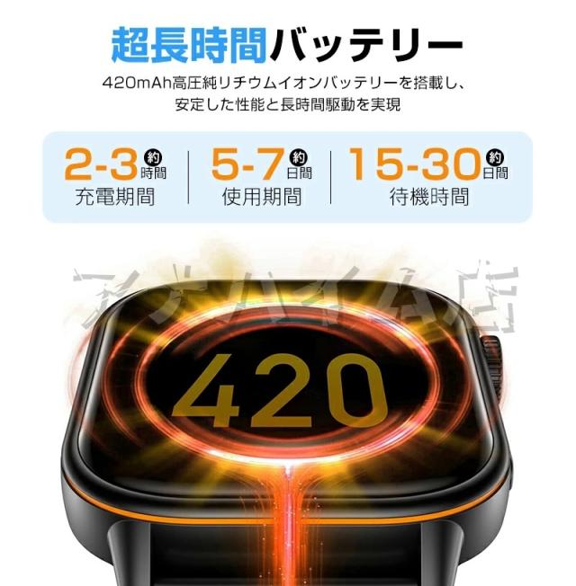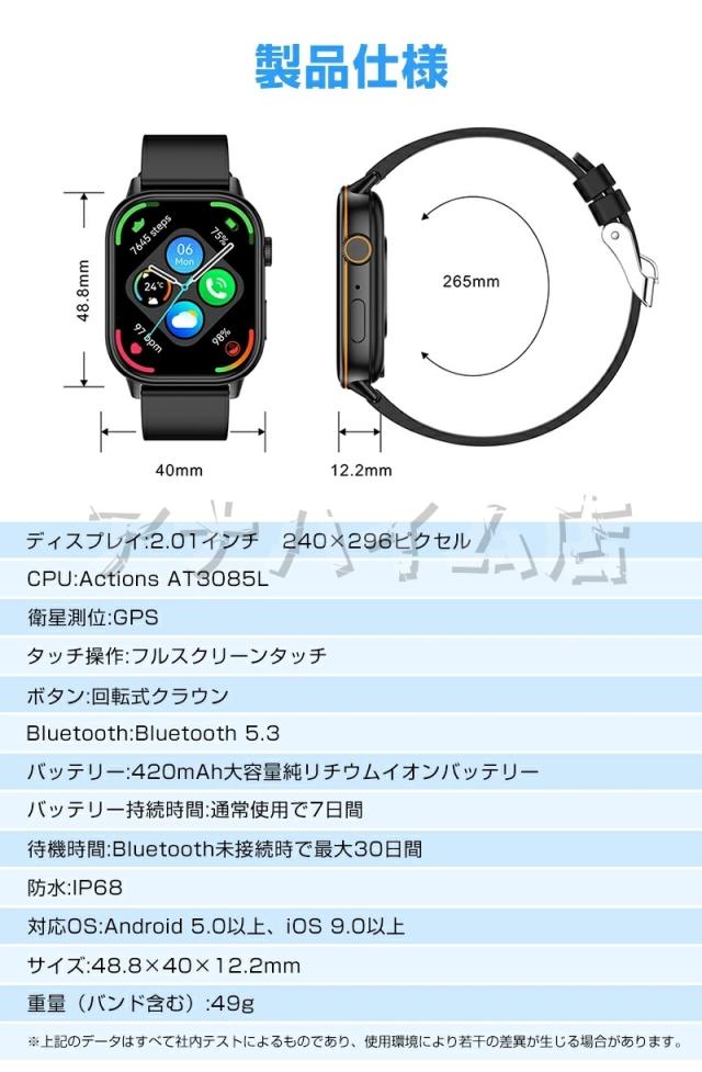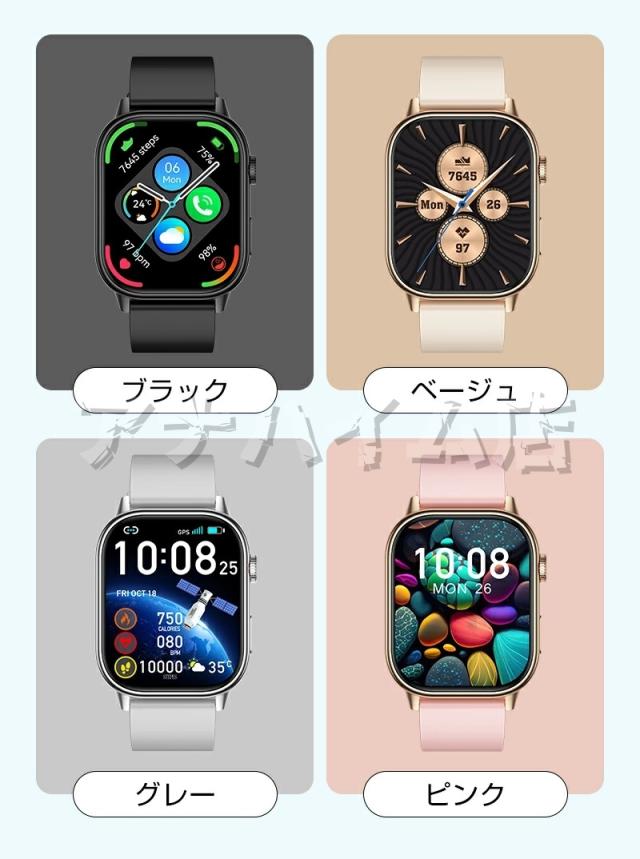・重さ:約48g ・ディスプレイサイズ:2.01インチ ・バンドサイズ:225×22mm ・解像度:240*296 ・ボタン:回転式クラウン ・タッチ操作:フルスクリ一ンタッチ ・Bluetooth:5.3 ・バッテリー容量:420mAh ・待機時間:Bluetooth未接続時で最大30日間 ・使用時間:5-7日(使用状況や機種により異なります) ・対応OS:Android4.4以降/IOS9.0以降 ・防水レベル:IP68 ・バンド素材:シリコンバンド ・カラー:ブラック、ベージュ、ピンク、グレー ・言語:日本語、英語、中国語、韓国語、ドイツ語等 |