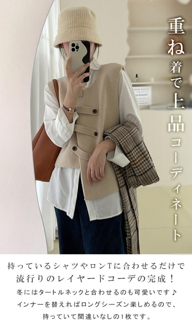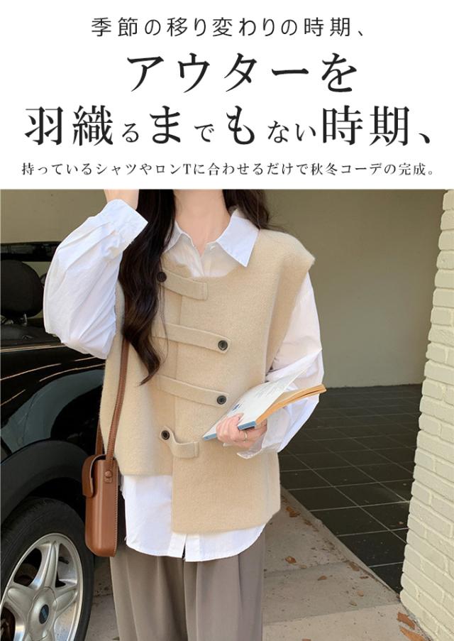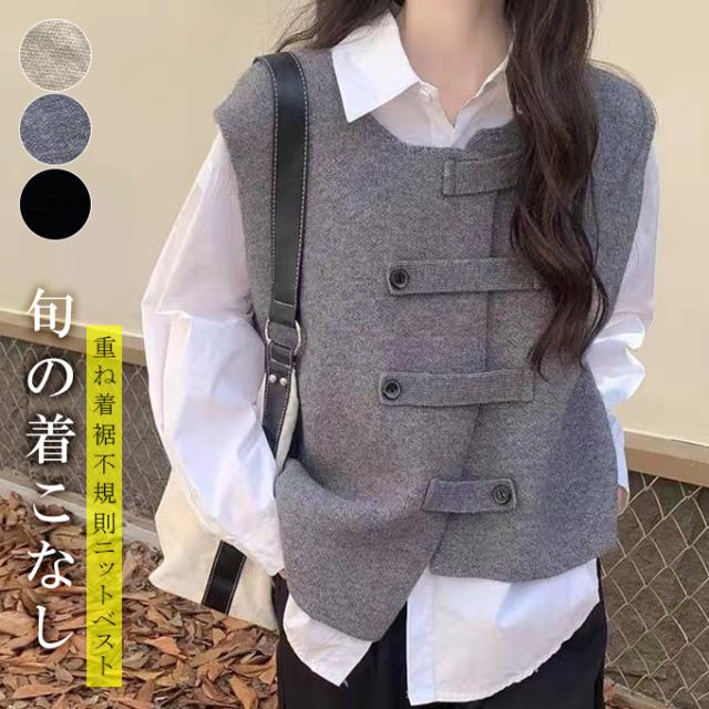 15%OFFク?ポン配布中、アシンメトリーベスト ニットベスト 裾不規則 個性的 秋冬 レディース 羽織り ラウンドネック ノースリーブ ボタン 前開き 重ね着 インナー レイヤード こなれ感 オシャレ きれいめ カジュアル 大人 寒さ対策 体型カバー