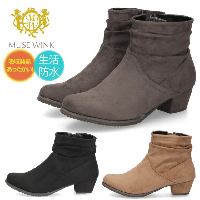 レディース ブーツ ショートブーツ 靴 防水 あったかい 吸湿発熱 ボア 防滑 サイドジッパー スエード 冬 黒 MUSE WINK 13171 ミューズウィンク