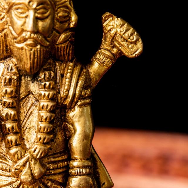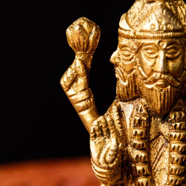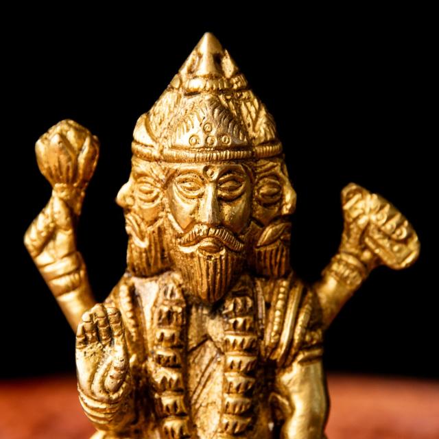ブラフマー神は、ヒンドゥー教の「創造」を司る神格で、ヴィシュヌ神(維持)・シヴァ神(破壊・変容)と並ぶ三大神(トリムールティ)のひと柱です。宇宙や世界、人間や生き物を「つくる」役割を担っている存在だとされています。「四つの顔と四本の腕」を持つ姿で表されます。四つの顔は、東西南北すべてを見渡せる「全方位的な知恵」や、「四つのヴェーダ(聖典)」を象徴していると言われます。