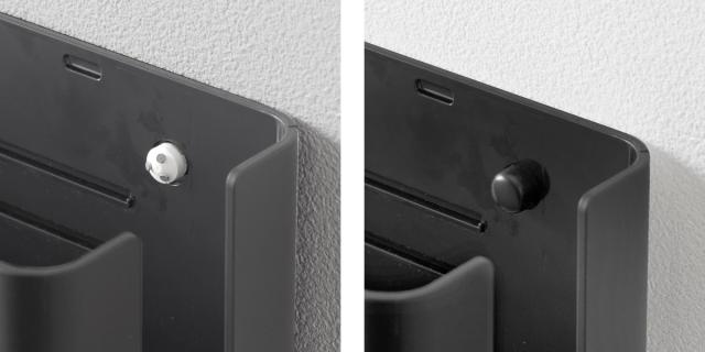 壁の穴が目立ちにくい、石こうボードピンで簡単に壁へ取り付けできます。蓋付きでホコリを防ぎ、浮かせて収納できるので掃除もラクラク。