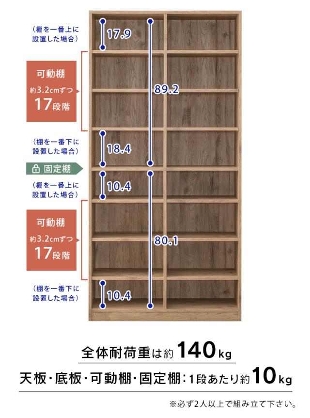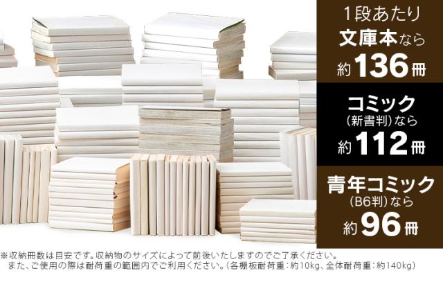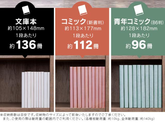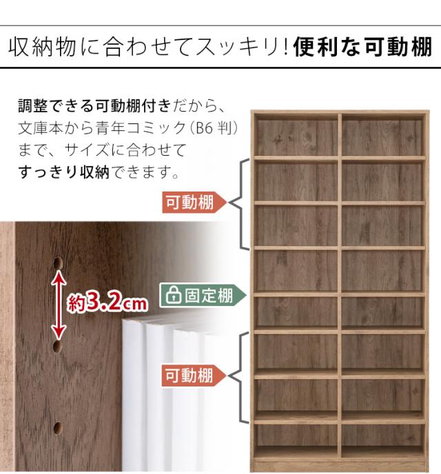 調整が可能な可動棚付きだから、文庫本から青年コミック(B6判)まで、サイズに合わせてすっきり収納できます。