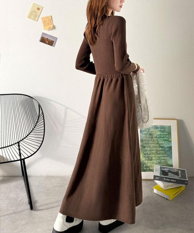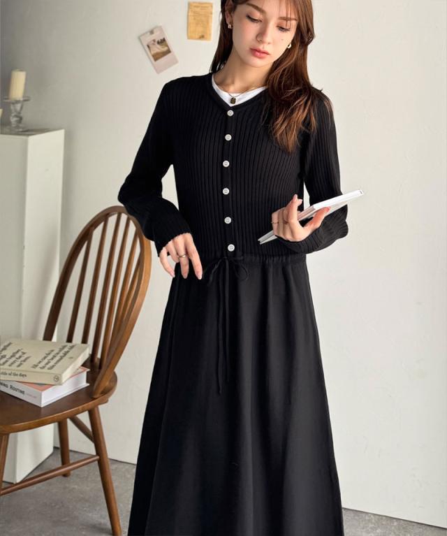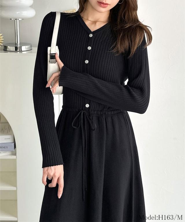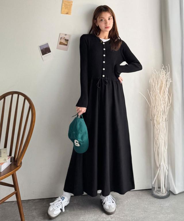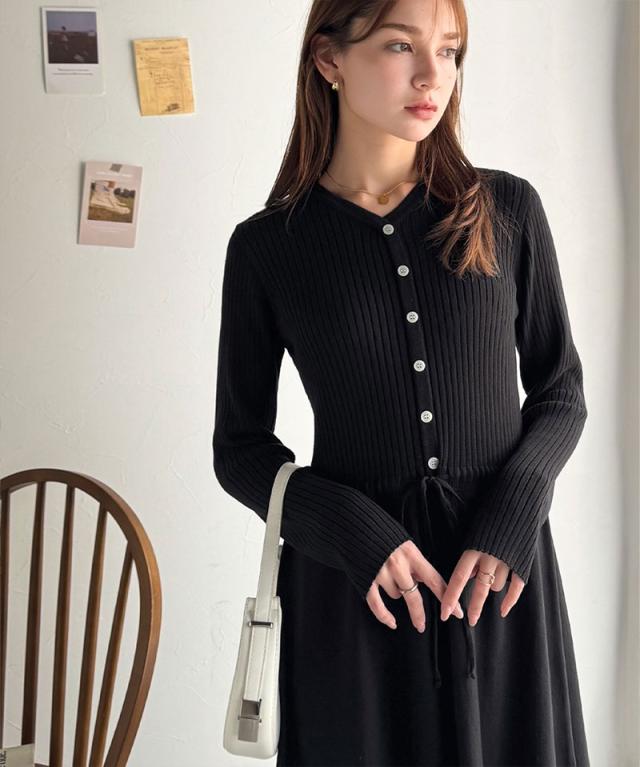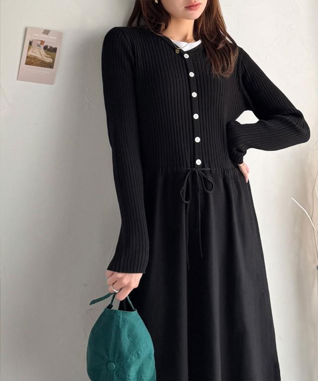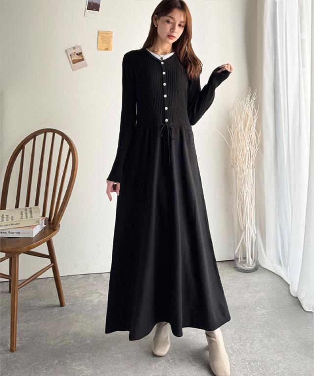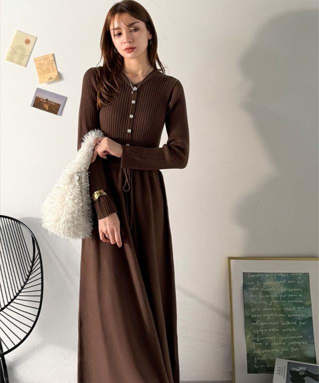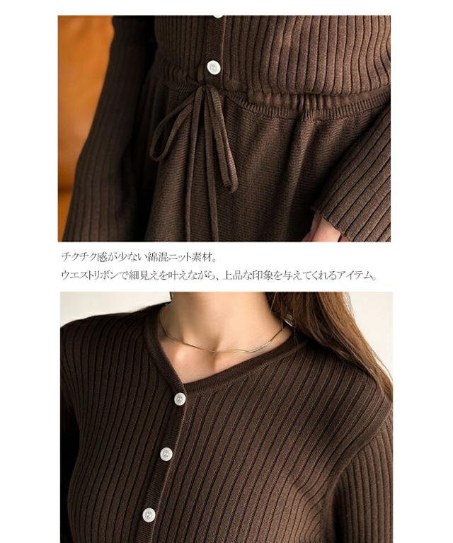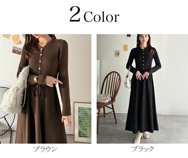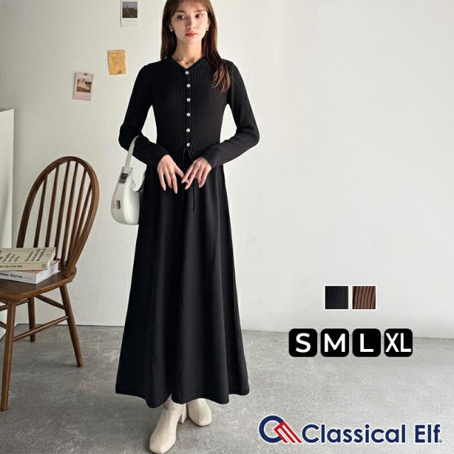 クラシカルエルフ冬新作 ワンピース きれい レディース ウエストリボン ニットワンピ ロング丈 リブ編み Aライン すっきり スタイルUP 長袖 フロント ボタン 大きいサイズ 2025aw ce1020288