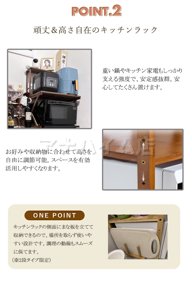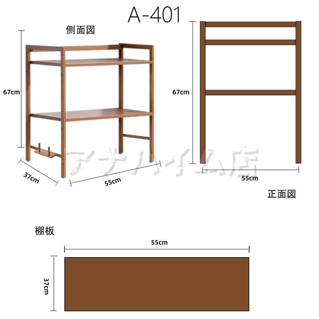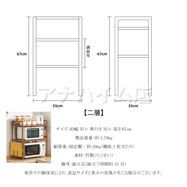 品名・キッチンラック 材質・成竹 サイズ・幅約550 × 奥行約350 × 高さ約360〜670mm (高さ調節可) 耐荷重・25Kg(1段あたり) 生産国・日本 ご使用上の注意 ・製品にゆがみ、 曲がり等がないかご確認の上、ご使用ください。 ・傾いたところや不安定なところでのご使用は危険です。 安定した所でご使用ください。 ・ものを収納したまま移動させたり、引きずって設置面等をキズつけないようご注意ください。 ・ものを収納する際は一か所に集中しないように耐荷重以内で均等に静かに置いてください。 ・その他、ご使用前に取扱説明書の「ご使用上の注意」をよくお読みください。 お手入れ方法 ・製品が汚れた場合は台所用中性洗剤を使用し水洗いしたあと、 よく乾燥させてください。 ・中性洗剤以外の洗剤等を使用すると、変色、変質の原因になりますのでご注意ください。 ・軽い汚れは柔らかい布で軽く拭いてください。 ・磨き粉、たわしなどで絶対にこすらないでください。 |