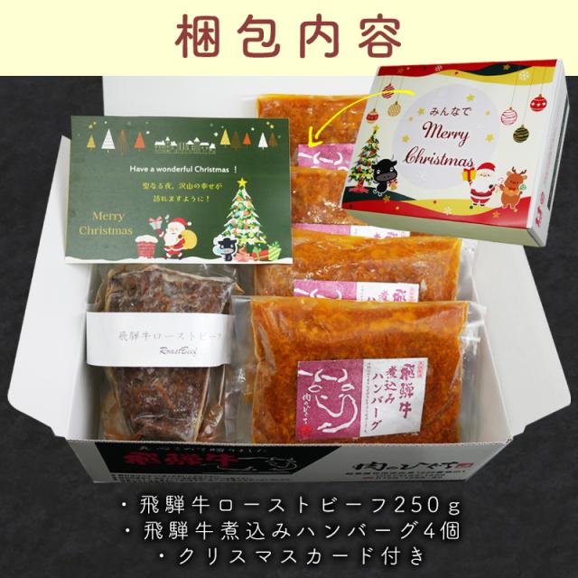 クリスマス 2025 Happy Christmas Box 飛騨牛 ローストビーフ 250g位 煮込み ハンバーグ 4個 送料無料 肉 牛肉 調理済み 黒毛和牛 プレゼント グルメ Xmas パーティー