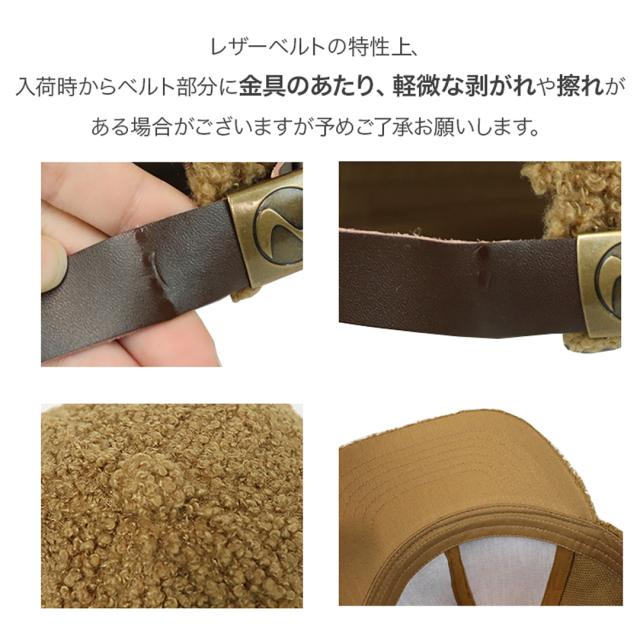 ツバはあらかじめ曲げられたカーブバイザーに、芯ありのしっかりとしたフロントパネル。アジャスター付のレザーベルト仕様なので、サイズ調整ができ、男女問わず着用していただけます。普段のおでかけはもちろん、キャンプやレジャーイベントの防寒対策にも◎