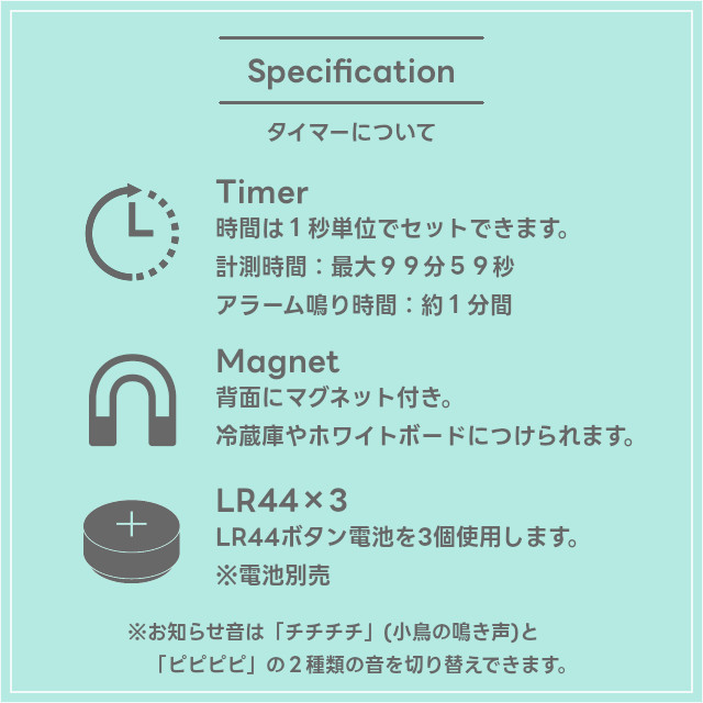 | お料理やお菓子作りにはもちろん、勉強や作業時間にメリハリをつけたい時にもおすすめなデジタルタイマー。 設定した時間が来ると窓が開き、ハト時計のようにかわいいシマエナガが顔を出してお知らせします。 背面にマグネットがついているので、冷蔵庫などにくっつきます。 右ボタンを長押しで、アラーム音の切替えも可能! お知らせ音は、「チチチチ」(小鳥の鳴き声)と「ピピピピ」の2種類の音を切り替えできます。 |