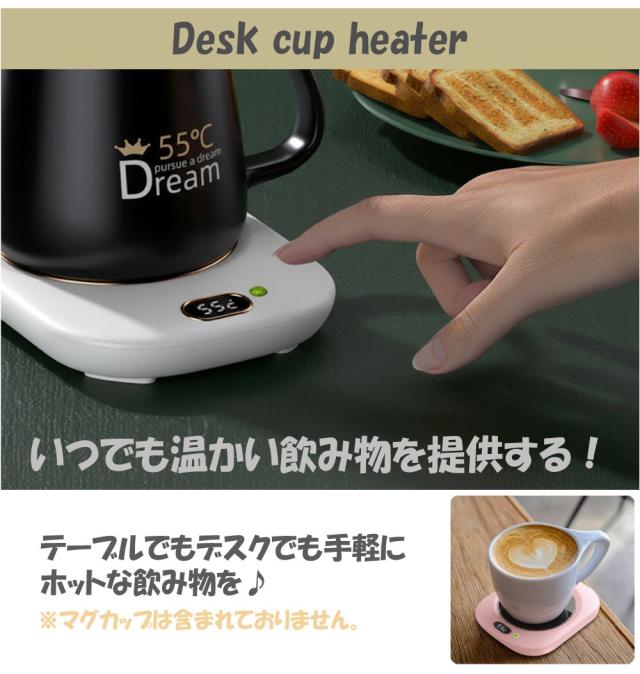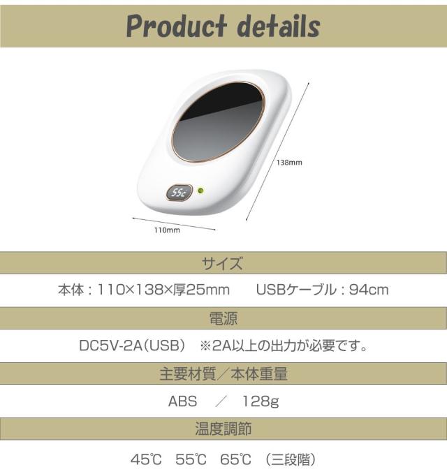 自宅やオフィス時間も快適。 デスクワークや、リラックスタイムにUSBをつないで温かな飲み物の温度をキープ。 低温45℃、中温55℃、高温65℃ の3段階の温度調整が可能! タッチスイッチで電源on/off&温度変更の操作もラクラク! USB給電式なので電池が必要なく持ち運びにも便利! |
