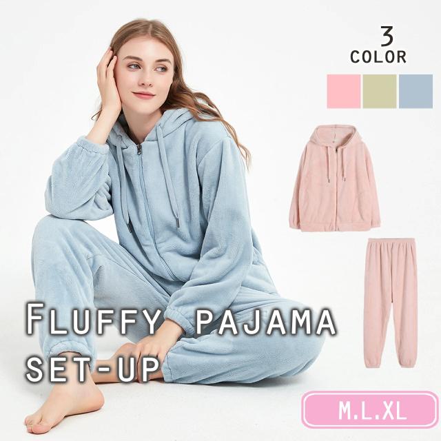 もこもこ パジャマ レディース 長袖 ルームウェア 上下セット 無地 フード付き 秋冬 部屋着 防寒 可愛い 着心地