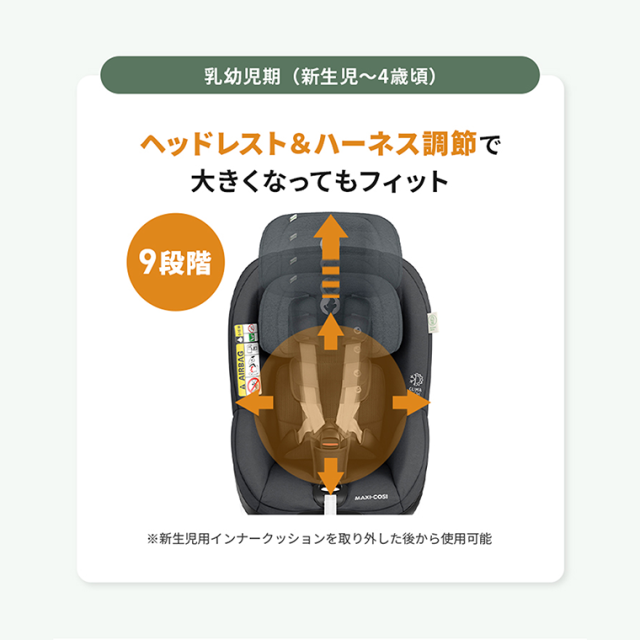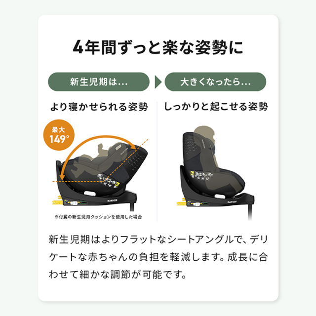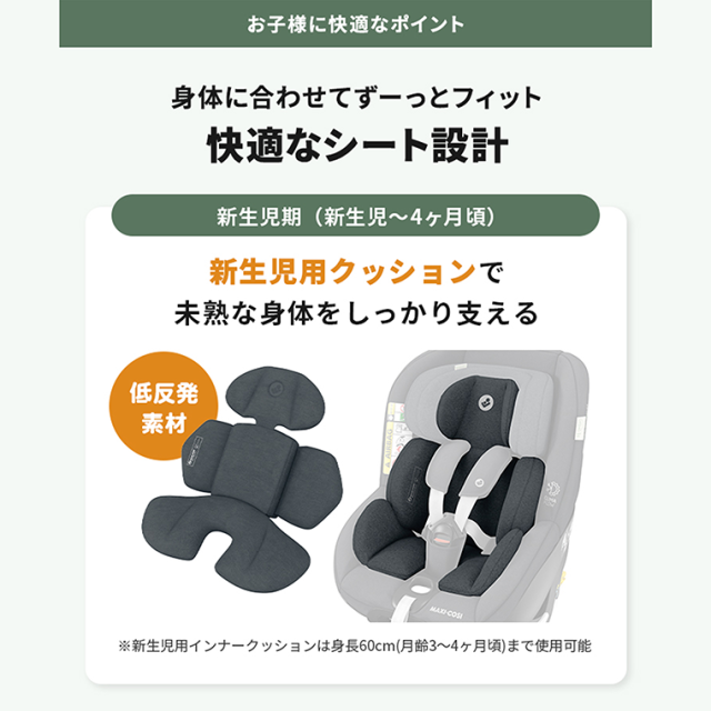 新生児用クッションが赤ちゃんの小さな体をしっかりとホールド。クッションを取外せば、4歳頃までの体格にもピッタリとフィットします。