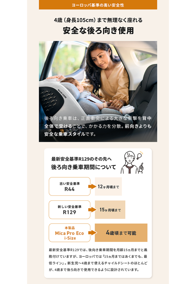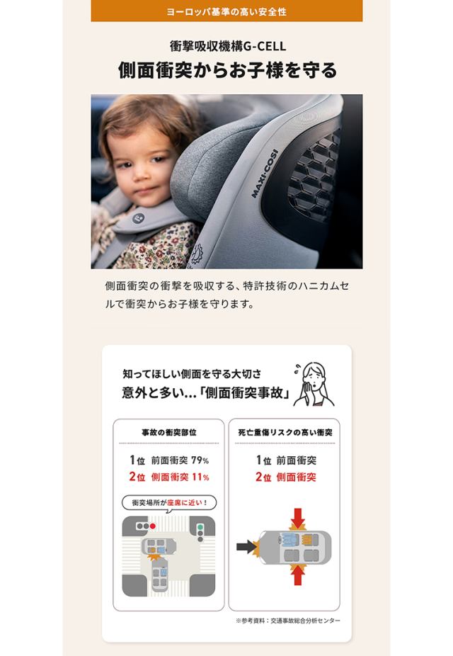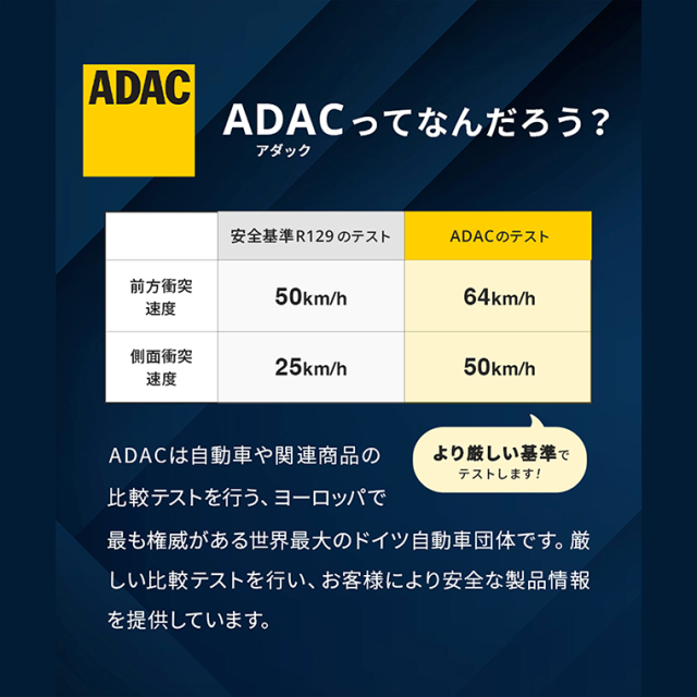 新安全基準R129よりも厳しい条件で行われるヨーロッパの消費者テストにおいて、高い成績を収め、安全の一歩先をいくチャイルドシートです。