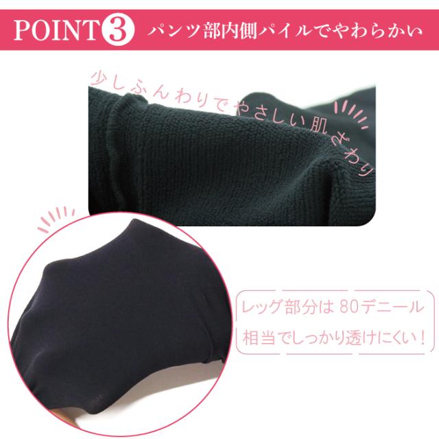 2.パンティ部内側パイル仕立て 3.ゾッキタイプ 4.レッグ部分は80デニール相当 5.抗菌防臭加工 6.バックネーム付き |