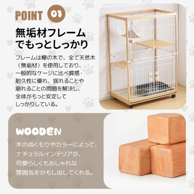 フレームは欅の木で、全て天然木(無垢材)を使用しており、一般的なケージに比べ質感・耐久性に優れ、揺れることや崩れることの問題を解決し、全体がもっと安定してしっかりしている。