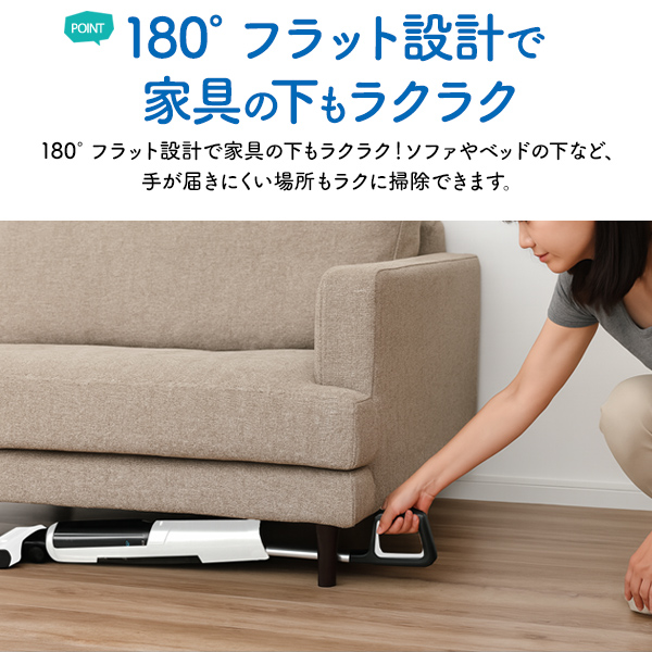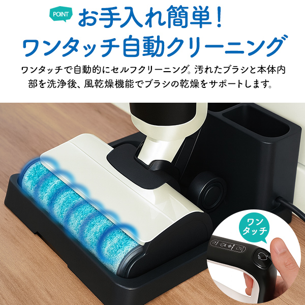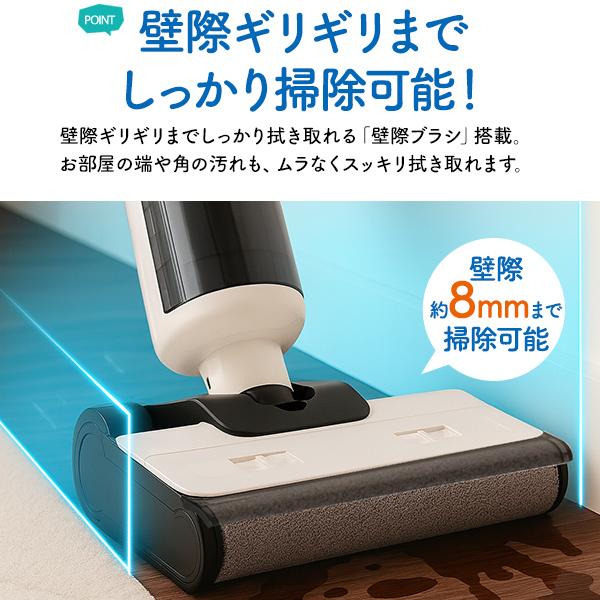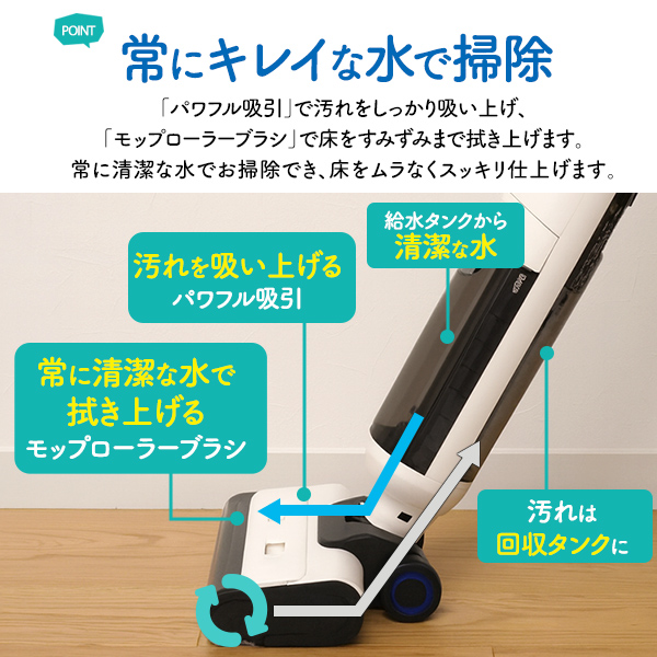 水拭き掃除機 汚れを吸いながら 水で拭き取る 水拭き コードレスクリーナー お手入れ簡単 自動クリーニング 自走式 パワーヘッド 壁際ギリギリまでしっかり拭き取る 壁際ブラシ 大掃除 家電 ワイヤレス 掃除道具