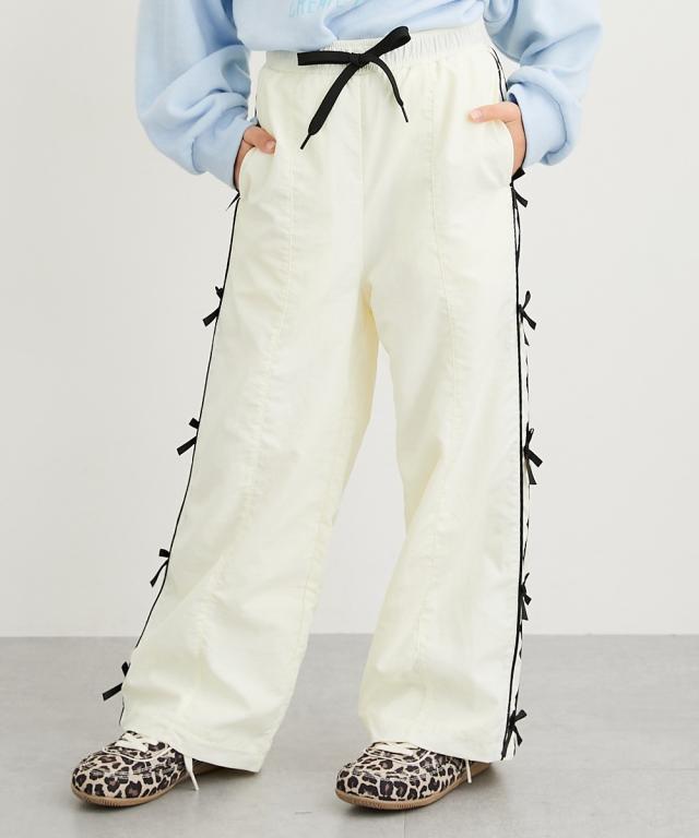 寒い季節も可愛くおしゃれに!裏フリースサイドリボンパイピングナイロンパンツが登場! ヒヤッとしないあったか素材で、お子様も快適に過ごせます。 オフホワイトとブラックの2色展開で、どんなトップスにも合わせやすい万能アイテムです。 ■デザイン ・サイドのリボンとパイピングデザインが可愛らしさをプラス。 ・ウエストはゴム仕様で着脱しやすく、締め付け感もありません。 ・ ゆったりとしたワイドレッグシルエットで、動きやすさも抜群です。 ■素材 ・裏フリース素材でしっかり暖か!寒い日のお出かけも安心です。 ■おすすめのスタイリング ・スウェットやパーカーと合わせてカジュアルスタイルに。足元はスニーカーでアクティブに! ・ニットやブラウスと合わせてきれいめカジュアルに。バレエシューズやブーツで上品さを演出。 ・TシャツやロンTと合わせてデイリーユースに。キャップやリュックでストリート感をプラス。 ・ワンピースやチュニックの下にレイヤードして、防寒対策とおしゃれを両立!