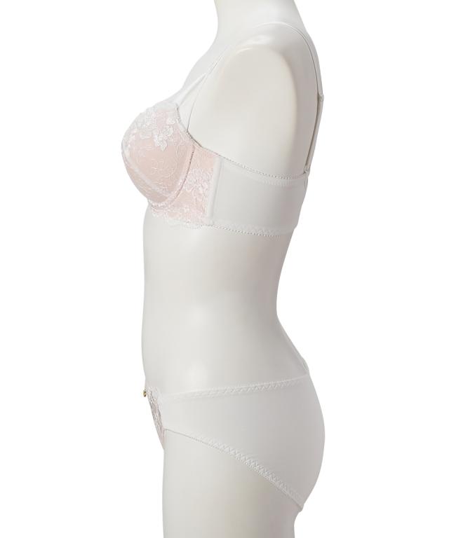 ヌーディーカラーが透けて大人かわいいブラセット。 シンプルなデザインであたりが出にくくフラワー刺繍が映える1着。 脇高仕様だから気になる脇肉もスッキリシルエット 下厚モールドカップで美しいバストラインヘ。 詳しいショーツサイズについては詳細画像内サイズ表を参考にお持ちのショーツと比較してみてください。