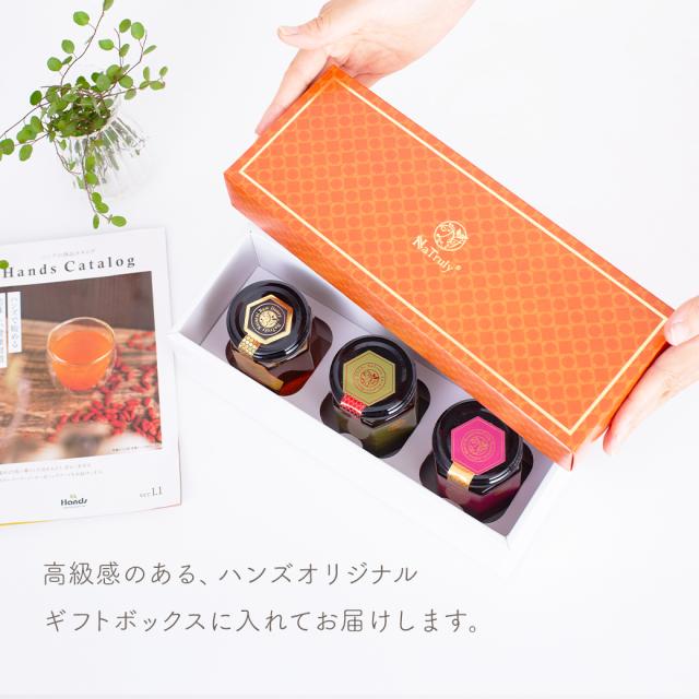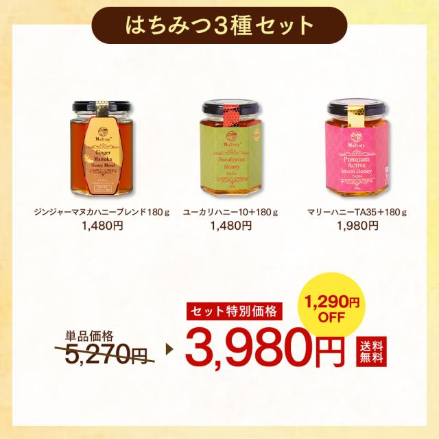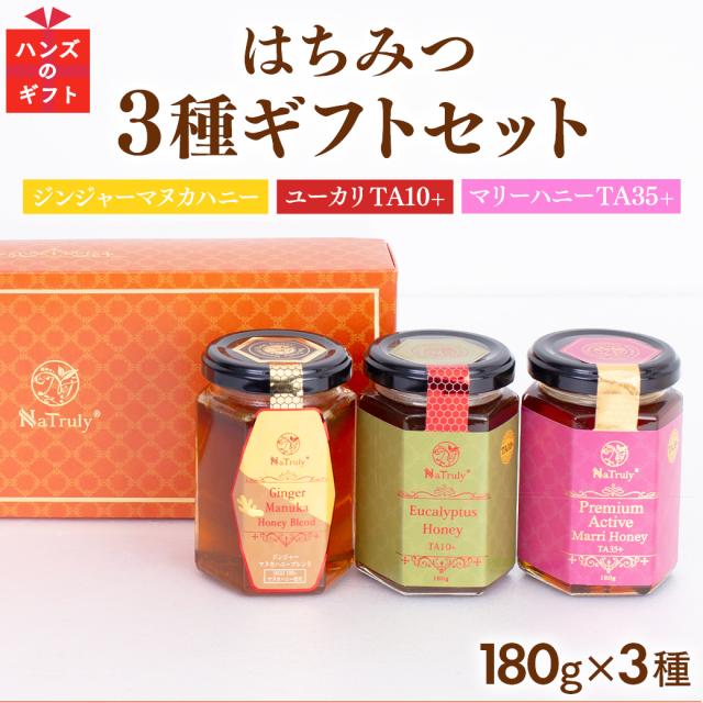 | セット内容 | ジンジャーマヌカハニーブレンド 180g ユーカリハニーTA10+ 180g マリーハニーTA35+ 180g ギフトボックス |