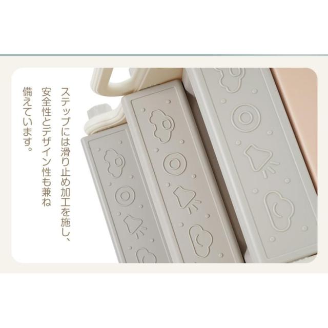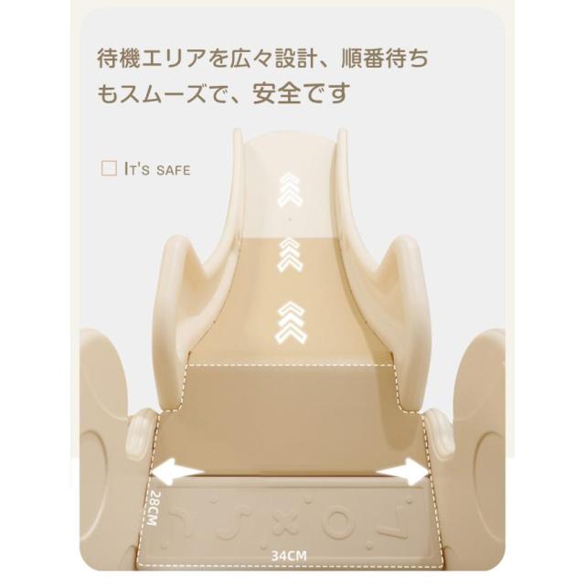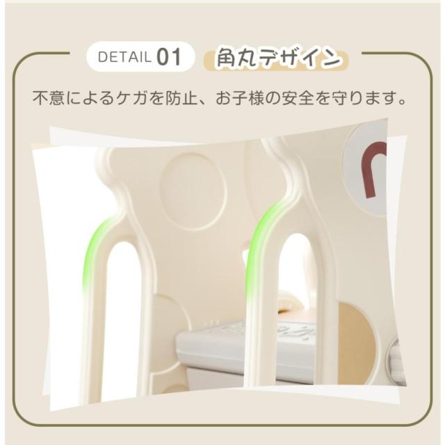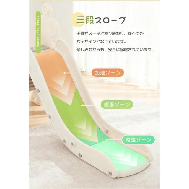 【三段スロープ】子供がス—ッと滑り終わり、ゆるやかなデザインとなっています。DETAIL:1.すべり止め 2.ステップ 位置ずれを防止 3.組立簡単 4.高め手すり 5.角丸デザイン不意によるケガを防止