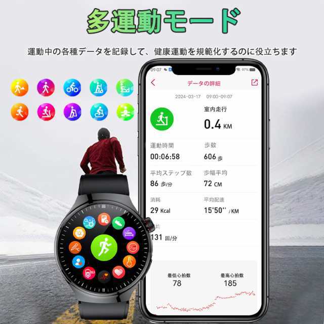 【Bluetooth5.1通話機能&音声アシスタント】スマートフォンとBluetooth接続すれば、電話の受信と応答を行うことができます。大切な電話を逃すことはありません。※※専用アプリと接続するとス マートウォッチで直接に電話をかけることや着信拒否も実現可能。運転中でも運動中でも両手を解放し、より効率的な通話ができます。音声アシスタント機能を搭載しており、スマートウォッチに話しかけるだけで音楽をかけてくれたり、アラームを設定してくれたり、スポーツモードを開始したりするなどの操作を実行できます。
