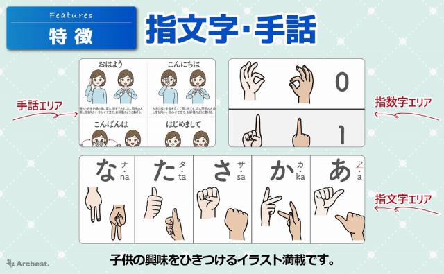 あいうえお・数字などの指文字と、「おはよう」「ありがとう」など実用的な手話12種類を収録。ユポ紙製の防水仕様なので、お風呂や洗面所でも長く使えます。