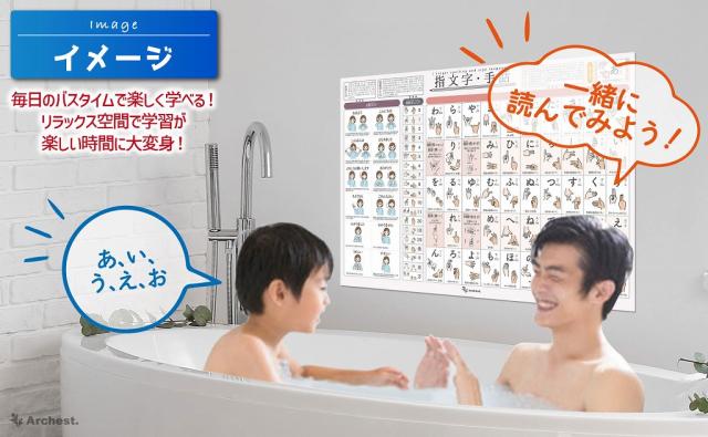 B3サイズのお風呂ポスター。子どもから大人まで使える「指文字・手話お風呂ポスター」です。聴覚障がいへの理解を深めながら、日常生活の中で自然と指文字・手話を学べるようにデザインされています。
