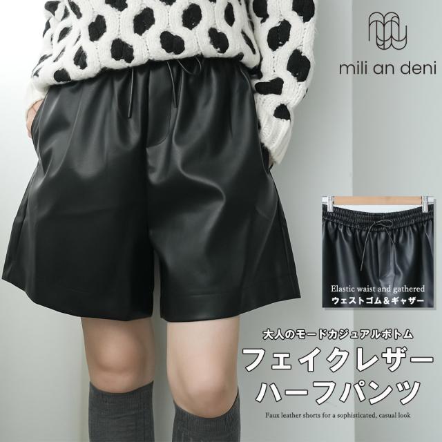 春新作 フェイクレザーハーフパンツ ショート丈 合成皮革 M ボトムス レディース 春夏 ミリアンデニ メール便(郵2)p62138